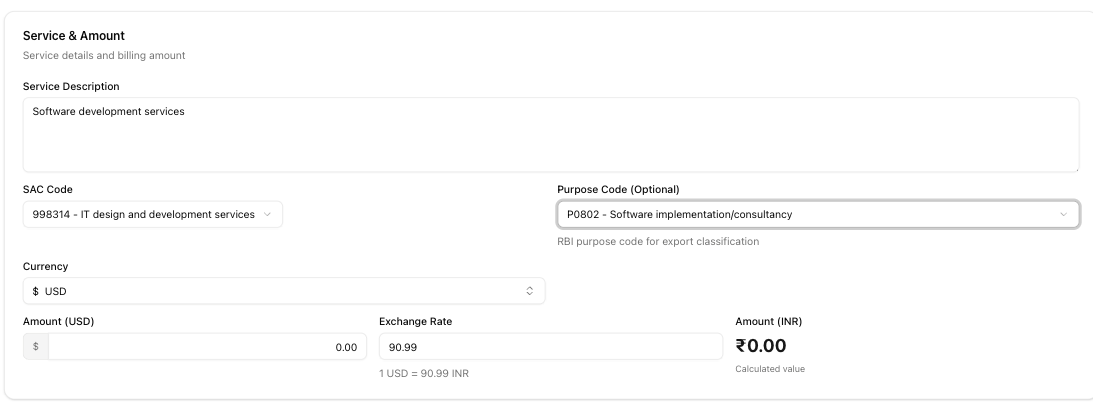 Purpose code — RBI classification for the transaction. 6 codes available: P0801 (hardware consultancy), P0802 (software implementation), P0803 (data processing), P0804 (repair and maintenance), P0805 (news agency services), and P0806 (other information services). P0802 is the most common for IT exports.