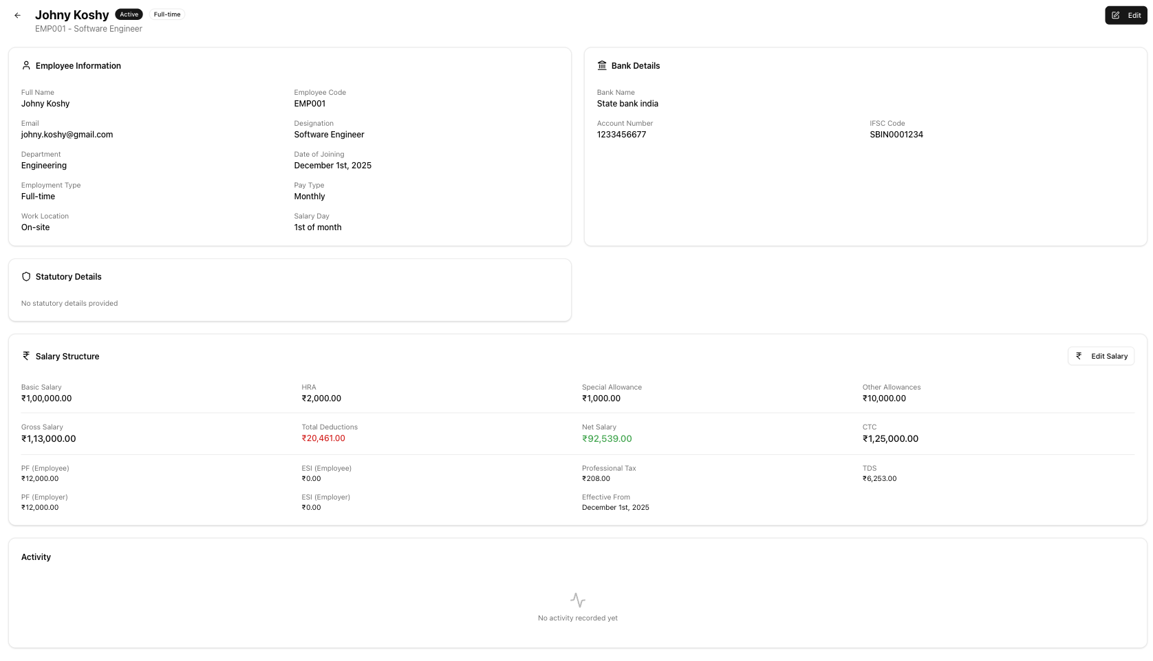 View an employee's full profile, salary breakdown, statutory details, bank information, and activity history on a single page