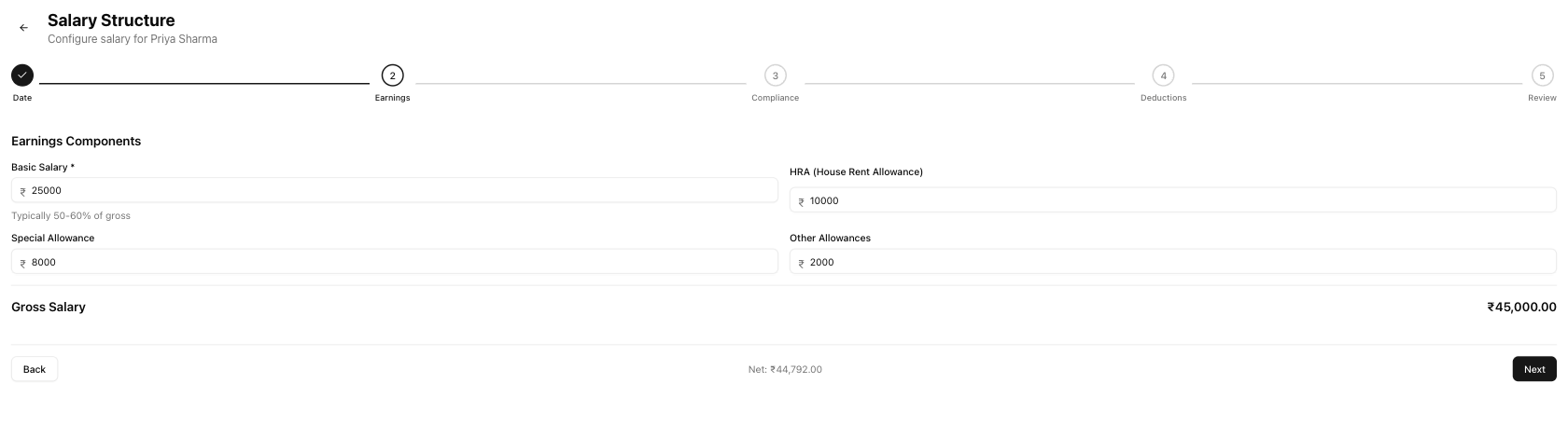 The wizard navigation bar shows "Net: ₹ amount" updated in real time as you fill in values across all steps. This lets you see the impact of each change on the employee's take-home pay without waiting for the review step.