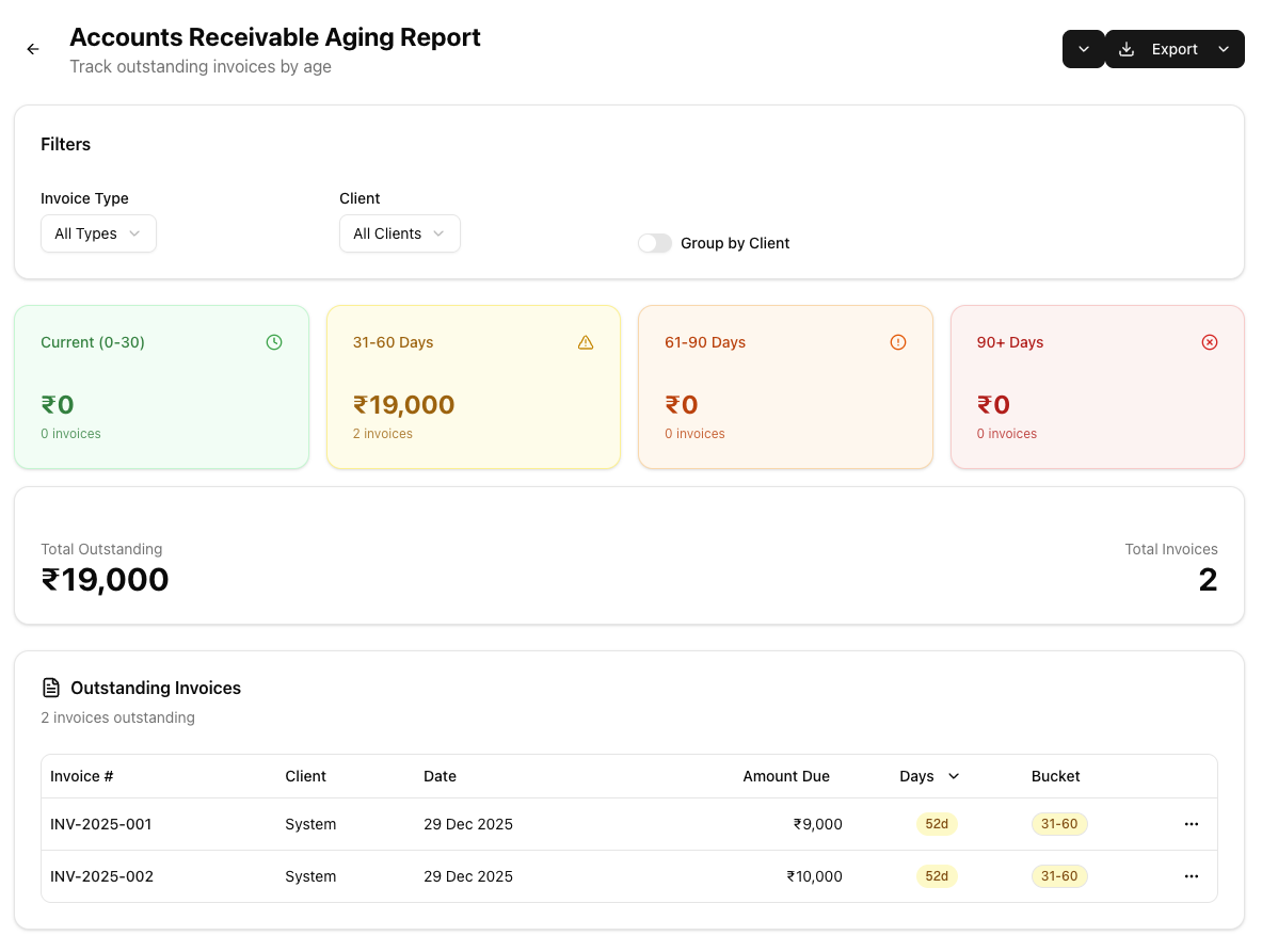 If you have the reports.export permission, a CSV export button is available in the report header. Clicking it downloads a file named aging-report-YYYY-MM-DD.csv containing the currently displayed data.