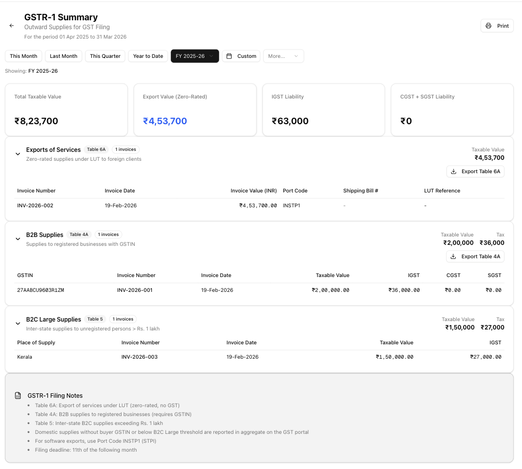 GSTR-1 is the monthly return of outward supplies that every registered GST taxpayer must file. The app pulls data from your invoices, classifies each one into the correct GSTR-1 table, and presents a ready-to-review summary. You still file the actual return on the GST portal — this report gives you the organised data you need to do that quickly and accurately.