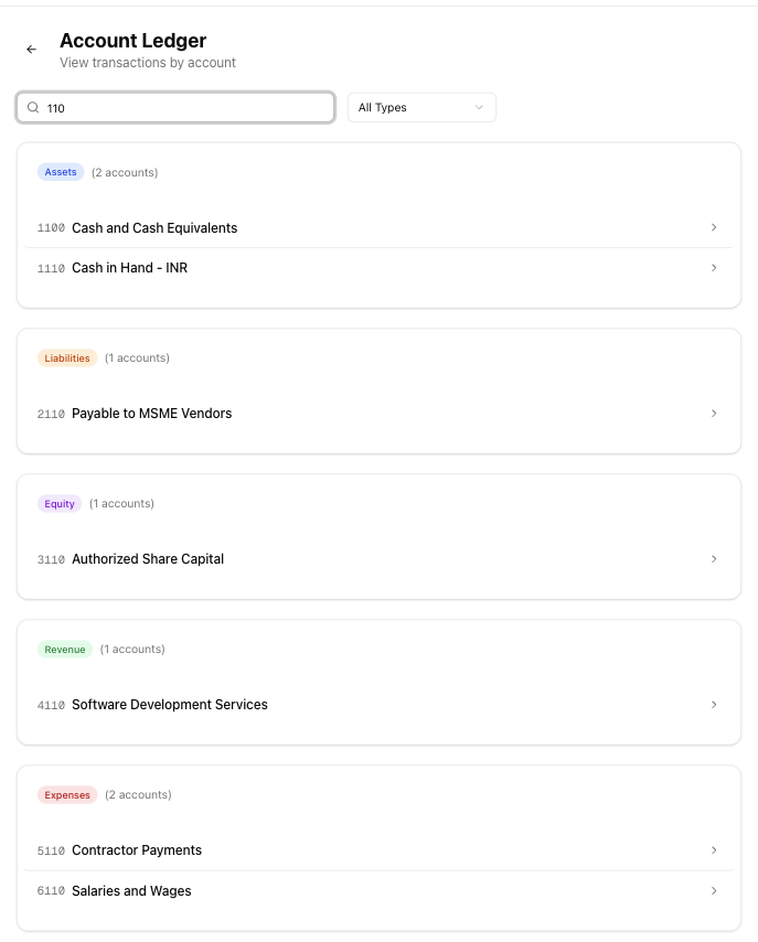 - Account type dropdown — Filter by All Types, Assets, Liabilities, Equity, Revenue, or Expenses. Selecting a type hides all other groups.