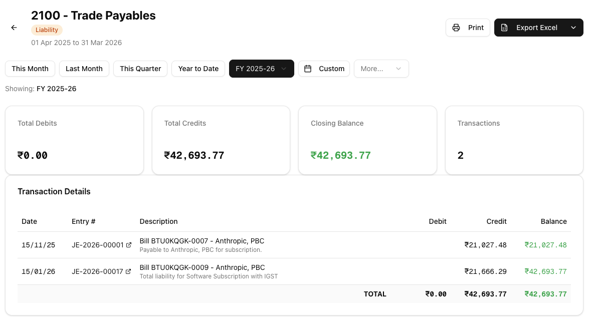 - Trial Balance — Verify that all account balances are correct before drilling into individual ledgers.