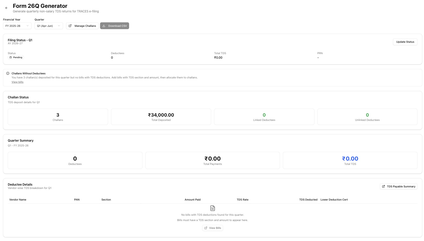 | Challans without deductees | Challans were deposited for the quarter but no bills have matching TDS entries | Add the corresponding bills in Expenses > Bills with TDS sections, then allocate them to the existing challans in TDS > Challans |
