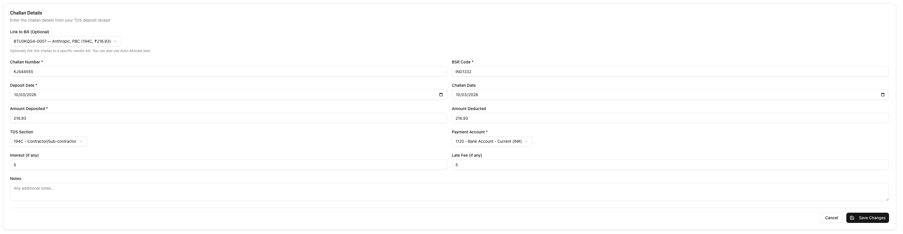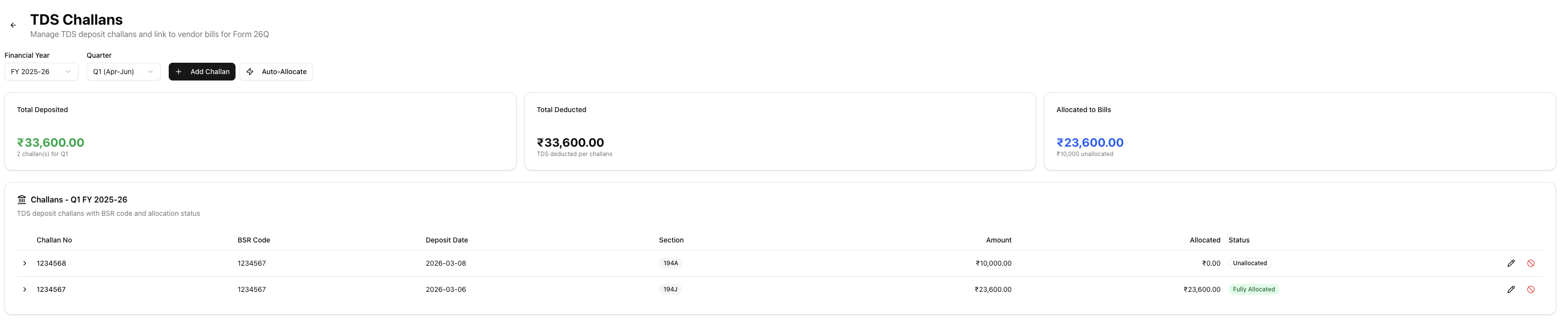 Record your TDS deposit challans, allocate them to vendor bills, and link deposits to quarterly Form 26Q returns.