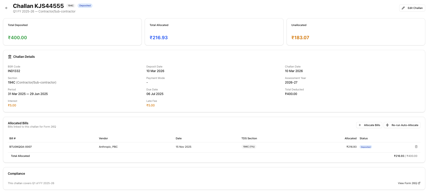 Each challan detail page includes a compliance card showing the quarter and financial year the challan covers. Click View Form 26Q to go directly to the Form 26Q page for that quarter, where the challan appears as part of the quarterly return data.