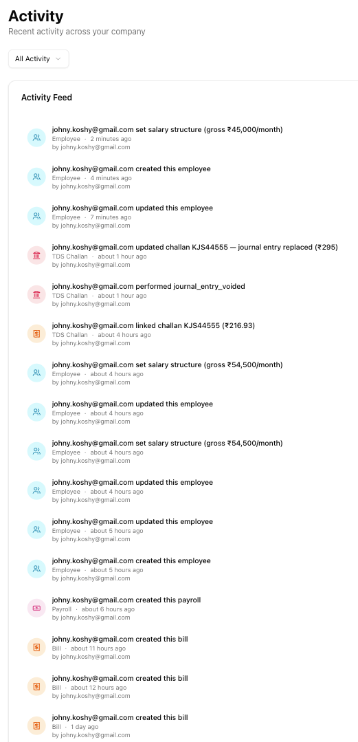 Track recent actions across your company — who did what, when, and to which record — with filtering by entity type